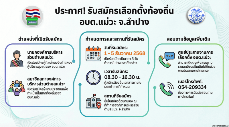 📣 การรับสมัคร นายกองค์การบริหารส่วนตำบล อบต.แม่วะ และสมาชิกสภาองค์การบริหารส่วนตำบล อบต.แม่วะ โดยมีกำหนดการรับสมัครระหว่าง วันที่ 1 ถึง 5 ธันวาคม 2568 ในช่วงเวลา 08.30 ถึง 16.30 น. ผู้สนใจต้อง ยื่นใบสมัครด้วยตนเอง ณ ที่ทำการองค์การบริหารส่วนตำบล อบต.แม่วะ ติดต่อสอบถามได้ที่ ศูนย์ประสานงานการเลือกตั้ง อบต.แม่วะ Tel : 054-209334