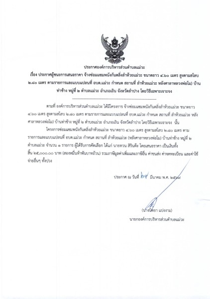📣 ประกาศผู้ชนะการเสนอราคา จ้างซ่อมแซมพนังกันตลิ่งลำห้วยแม่วะ ขนาดยาว ๔.๖๐ เมตร สูงตามสโลบ ๒.๔๐ เมตร ตามรายการและแบบแปลนที่ อบต.แม่วะ กำหนด สถานที่ ลำห้วยแม่วะ หลังศาลาหลวงพ่อโม) บ้านท่าช้าง หมู่ที่ ๒ ตำบลแม่วะ อำเภอเถิน จังหวัดลำปาง โดยวิธีเฉพาะเจาะจง