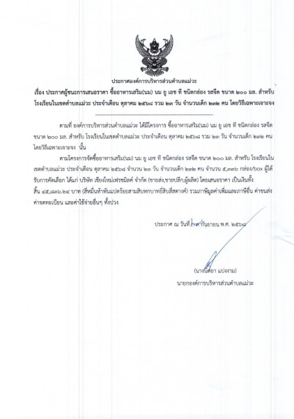 ประกาศผู้ชนะการเสนอราคา ซื้ออาหารเสริม(นม) นม ยูเอช ที ชนิดกล่อง รสจืด ขนาด ๒๐๐ มล.สำหรับโรงเรียนในเขตตำบลแม่วะ ประจำเดือน ตุลาคม ๒๕๖๘ รวม ๒๓ วัน จำนวนเด็ก ๒๓๒ คน โดยวิธีเฉพาะเจาะจง