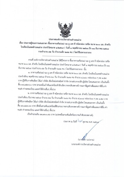 ประกาศผู้ชนะการเสนอราคา ซื้ออาหารเสริม(นม) นม ยู เอช ที ชนิดกล่อง รสจืด ขนาด ๒๐๐ มล. สำหรับโรงเรียนในเขตตำบลแม่วะ ประจำไตรมาส ๑/๒๕๖๙ ( วันที่ ๑ พฤศจิกายน ๒๕๖๘ ถึง ๓๑ ธันวาคม ๒๕๖๘ รวมจำนวน ๔๒ วัน จำนวนเด็ก ๒๓๒ คน ) โดยวิธีเฉพาะเจาะจง