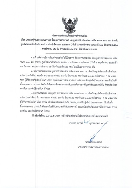 ประกาศผู้ชนะการเสนอราคา ซื้ออาหารเสริม(นม) นม ยู เอช ที ชนิดกล่อง รสจืด ขนาด ๒๐๐ มล. สำหรับศูนย์พัฒนาเด็กเล็กตำบลแม่วะ ประจำไตรมาส ๑/๒๕๖๙ ( วันที่ ๑ พฤศจิกายน ๒๕๖๘ ถึง ๓๑ ธันวาคม ๒๕๖๘ รวมจำนวน ๔๒ วัน จำนวนเด็ก ๕๒ คน ) โดยวิธีเฉพาะเจาะจง