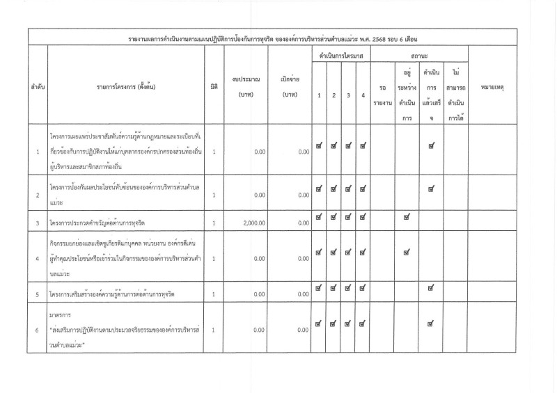 รายงานผลการดำเนินงานตามแผนปฏิบัติการป้องกันการทุจริต ขององค์การบริหารส่วนตำบลแม่วะ พ.ศ. 2568 รอบ 6 เดือน