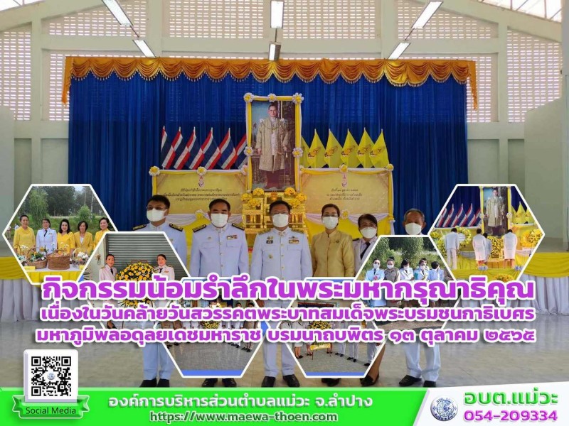 เมื่อวันพฤหัสบดี ที่ ๑๓ ตุลาคม พ.ศ.๒๕๖๕ องค์การบริหารส่วนตำบลแม่วะ นำโดยนางนิตยา แปงงาม นายกองค์การบริหารส่วนตำบลแม่วะ นายนิวัติ ชัยวงศ์ ปลัดองค์การบริหารส่วนตำบลแม่วะ พร้อมด้วยข้าราชการ พนักงาน และสมาชิกสภาองค์การบริหารส่วนตำบลแม่วะได้เข้าร่วมกิจกรรมน้อมรำลึกในพระมหากรุณาธิคุณ เนื่องในวันคล้ายวันสวรรคตพระบาทสมเด็จพระบรมชนกาธิเบศร มหาภูมิพลอดุลยเดชมหาราช บรมนาถบพิตร ๑๓ ตุลาคม ๒๕๖๕ โดยมีกิจกรรมภาคเช้าพิธีทำบุญตักบาตรถวายเป็นพระราชกุศล และกิจกรรมภาคค่ำพิธีวางพวงมาลา ณ หอประชุมที่ว่าการอำเภอเถิน อำเภอเถิน จังหวัดลำปาง