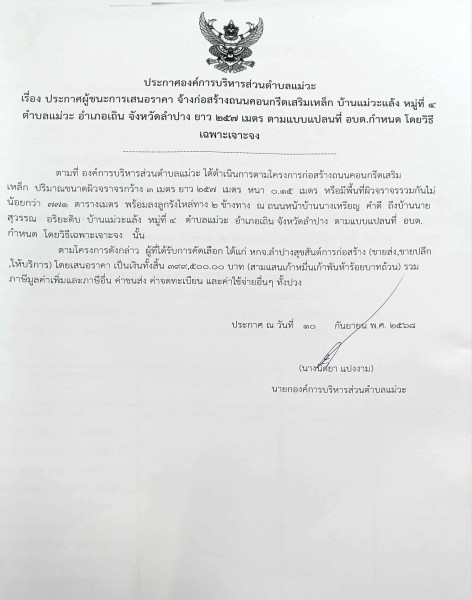ประกาศผู้ชนะการเสนอราคา จ้างก่อสร้างถนนคอนกรีตเสริมเหล็ก บ้านแม่วะแล้ง หมู่ที่ ๔ ตำบลแม่วะ อำเภอเถิน จังหวัดลำปาง ยาว ๒๕๗ เมตร ตามแบบแปลนที่ อบต.กำหนด โดยวิธีเฉพาะเจาะจง