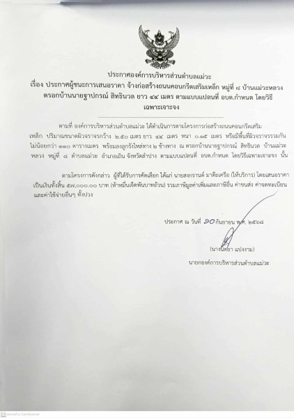 ประกาศผู้ชนะการเสนอราคา จ้างก่อสร้างถนนคอนกรีตเสริมเหล็ก หมู่ที่ ๘ บ้านแม่วะหลวงตรอกบ้านนายฐาปกรณ์ สิทธินวล ยาว ๔๔ เมตร ตามแบบแปลนที่ อบต.กำหนด โดยวิธีเฉพาะเจาะจง