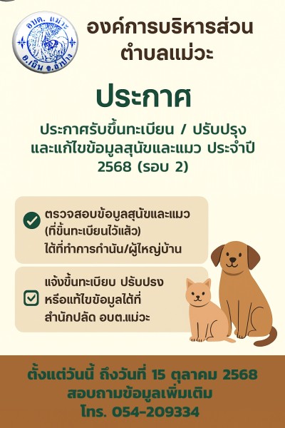 องค์การบริหารส่วนตำบลแม่วะ เปิดรับการ ขึ้นทะเบียนสุนัขและแมว รวมทั้งการปรับปรุงและแก้ไขข้อมูล ประจำปี 2568 (รอบ 2) โดยท่านสามารถ