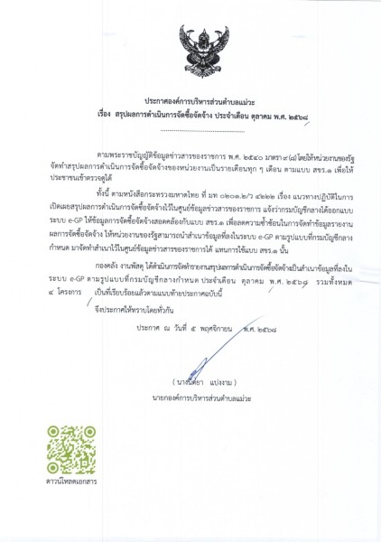 📣 สรุปผลการดำเนินการจัดซื้อจัดจ้าง ประจำเดือน ตุลาคม พ.ศ. ๒๕๖๘