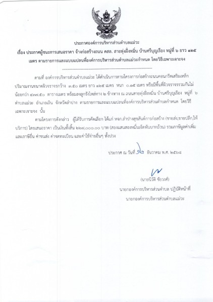 📣 ประกาศผู้ชนะการเสนอราคา จ้างก่อสร้างถนน คสล. สายทุ่งฝั่งหมิ่น บ้านศรีบุญเรือง หมู่ที่ ๖ ยาว ๑๒๕ เมตร ตามรายการและแบบแปลนที่องค์การบริหารส่วนตำบลแม่วะกำหนด โดยวิธีเฉพาะเจาะจง