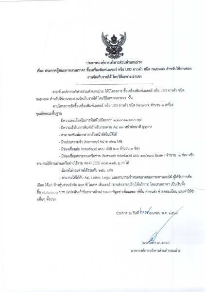 📣 ประกาศผู้ชนะการเสนอราคา ซื้อเครื่องพิมพ์เลเซอร์ หรือ LED ขาวดำ ชนิด Network สำหรับใช้งานของงานจัดเก็บรายได้ โดยวิธีเฉพาะเจาะจง