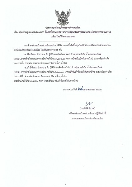 📣 ประกาศผู้ชนะการเสนอราคา ซื้อจัดซื้อครุภัณฑ์สำนักงานใช้งานประจำห้องนายกองค์การบริหารส่วนตำบลแม่วะ โดยวิธีเฉพาะเจาะจง